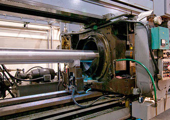External Cold Roll Extrusion utilizes a mandrel over which the hollow is placed. Two (2) annular die rings are brought into position on the hollow. The mandrel and hollow are rotated while the die rings progress axially through a series of passes. This simultaneously reduces wall thickness and O.D. while the hollow grows in length. The I.D. remains constant.